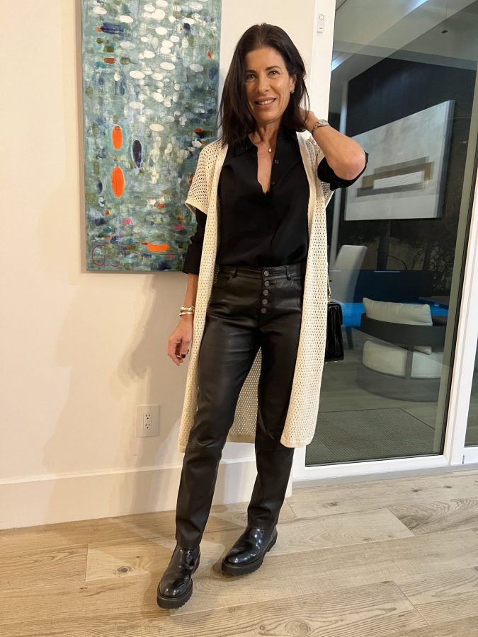 Black blouse, black leather jeans, open-knit cardigan, black lug sole boots for walking to dinner out in St. Petersburg, FL