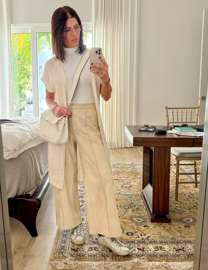 For a car trip to Naples, FL, I wore a sleeveless white bodysuit, bisque suede pants, the open-weave cardigan from before, distressed sneakers, and a cross-body white bag. I love the look of a white bag in winter.