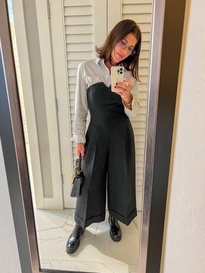 For dinner out at The French in Naples, FL, I wore a white blouse with metallic threads, this new fun jumpsuit, black boots (husband strongly dislikes them, yet I wear them anyway), and carried a structured, top-handled patent black bag.