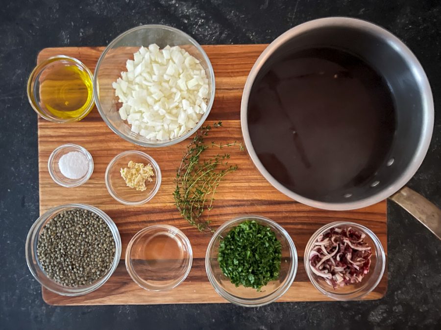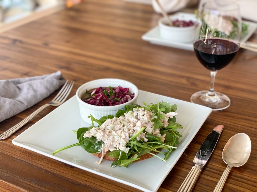 lentil soup garnished with chopped radicchio, open-faced chicken salad sandwich lunch with a small glass of red