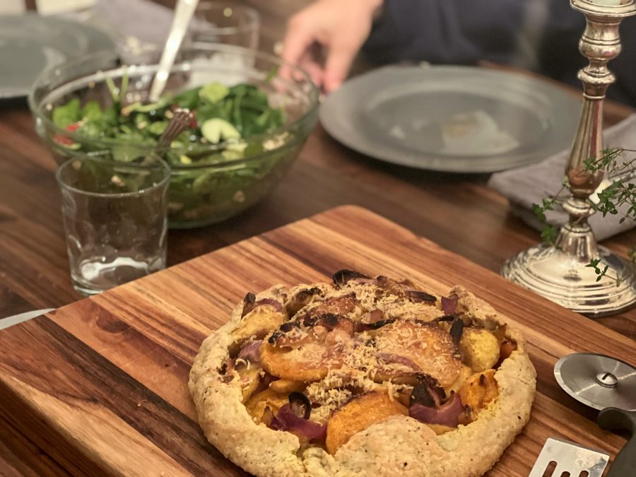 rustic curried squash and red onion galette with ricotta cheese filling (recipe called for sour cream and none in the house so improvised with what was on hand)