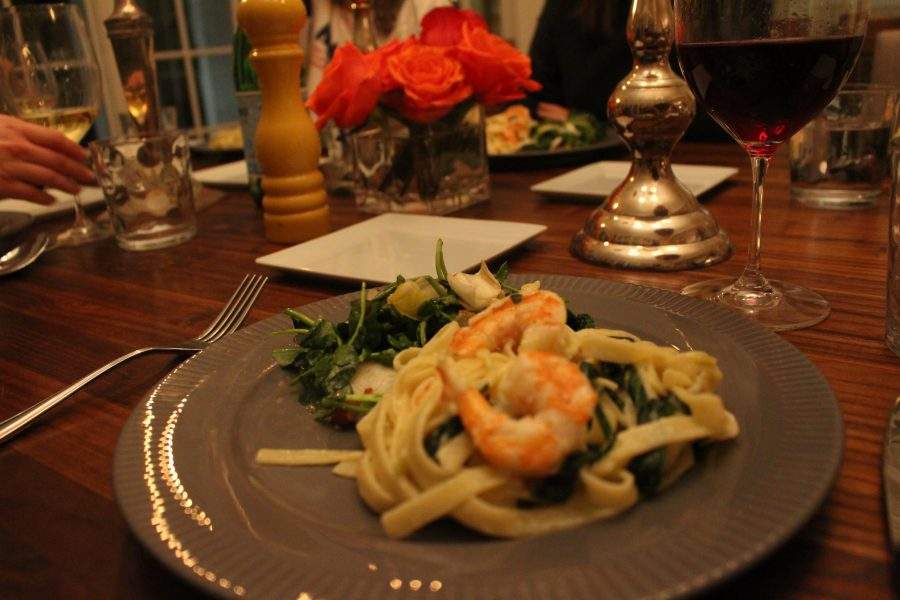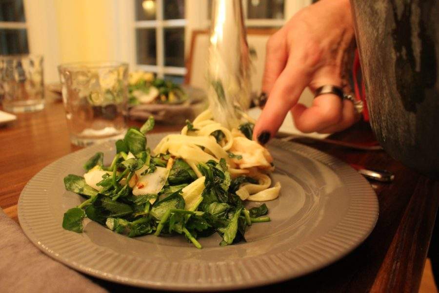 watercress and endive salad, fettuccine with shrimp. notice the motive ring? separate post coming soon… dishing it out, merci yeah, no KETO, sorrytotally missing her…