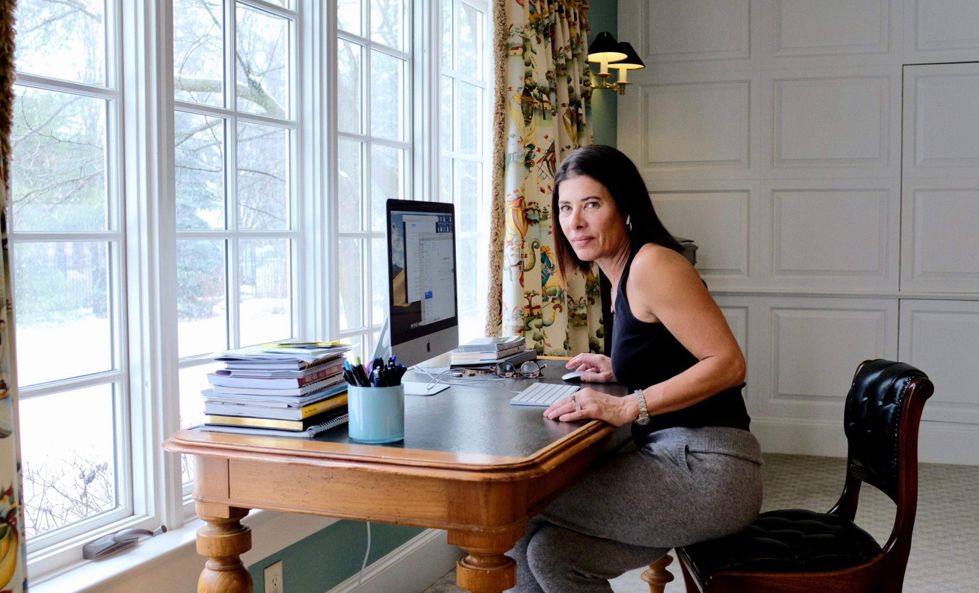 As for style when working at home I’m all about a favorite pair of blue jeans, these are boyfriend style, can’t really get on the high-rise kick, a tank for when it gets hot, and simple, easy cashmere pieces.