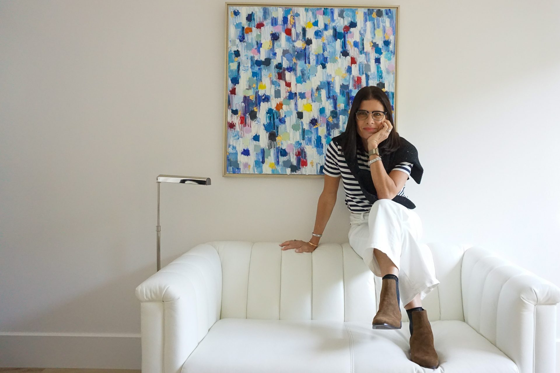 white denim, suede boots, striped tee and a great crewneck keep things easy