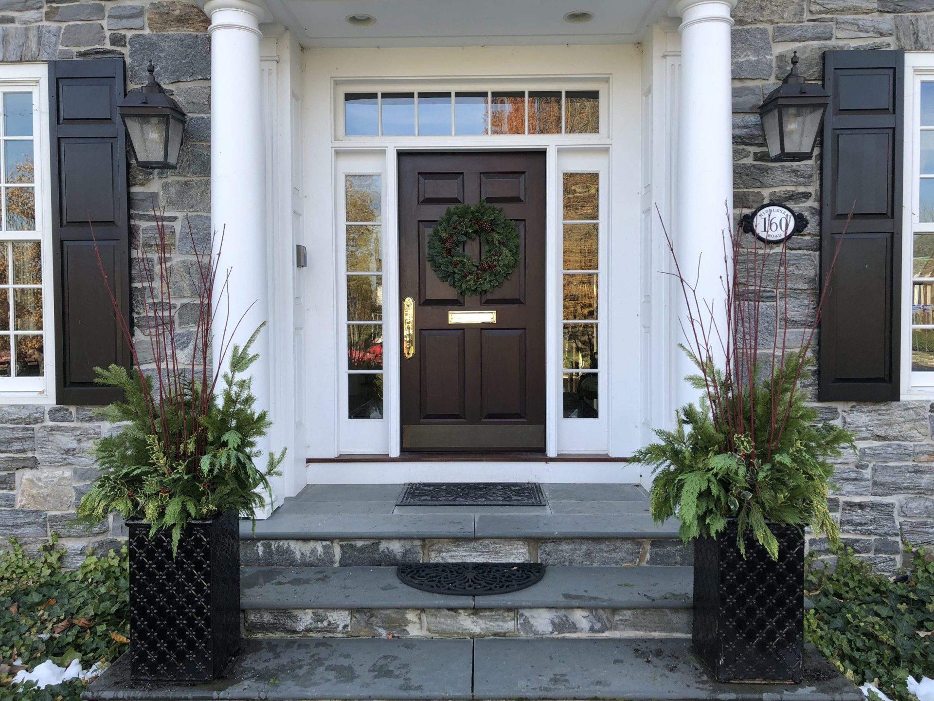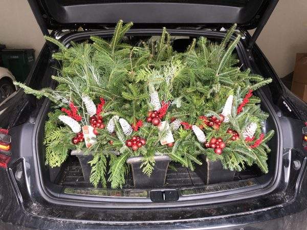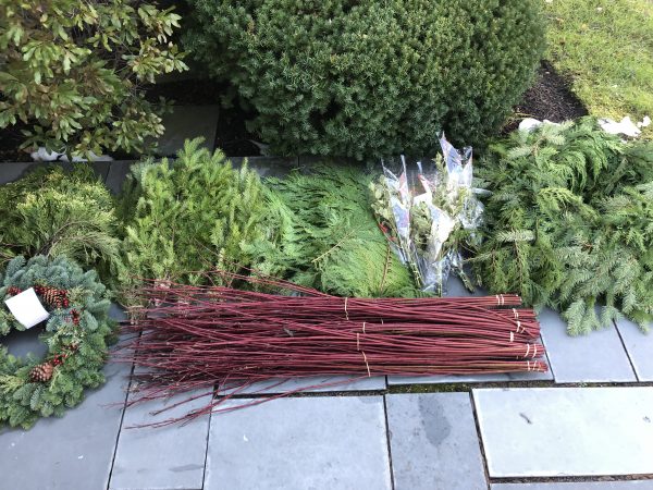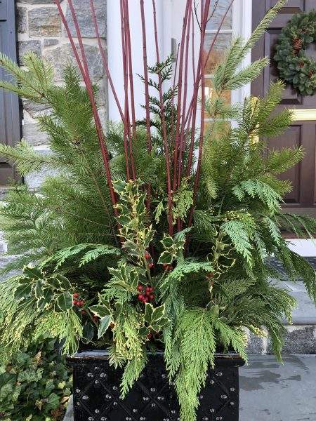 Decided to YouTube outdoor planters, and with some new inspiration pulled out the iPhone and called around to local nurseries for fresh-cut greens, and in particular red twig dogwood branches. Found a source, thank you Elber’s, and off we went. An SUV full later, two planters in, and we’re on our way to a natural, pretty, and evergreen holiday look for the outside of our still standing home.