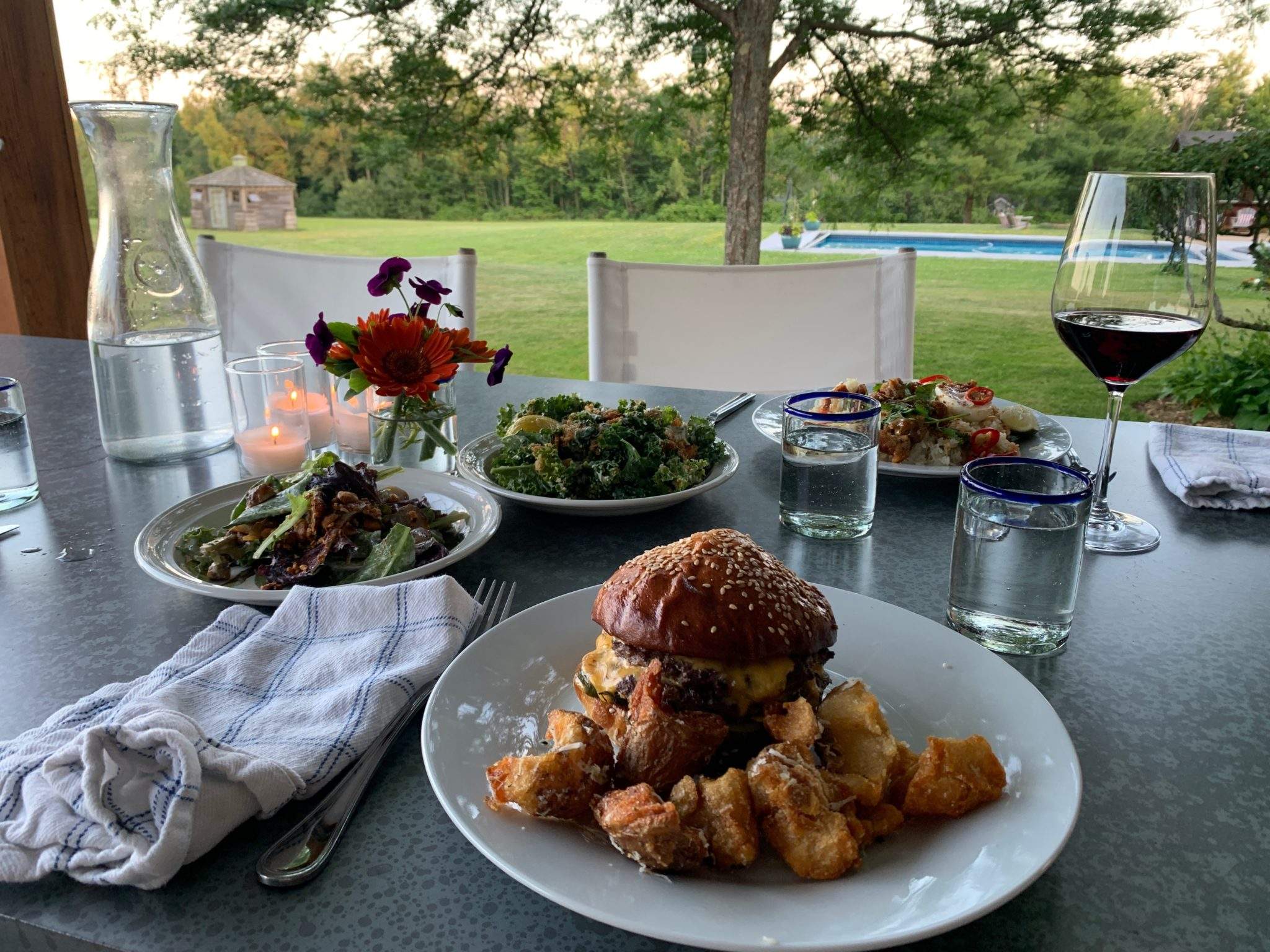 We order dinner in maybe once a week or so. We think of it as ‘takeaway,’ our nod to lost London, isn’t that romantic? We tip the staff as if we were actually in their restaurant and the meal and the experience was a ten plus. We take the food out of the paper containers and set it on plates. We have simple flowers and light the candles. We might put on a dress.