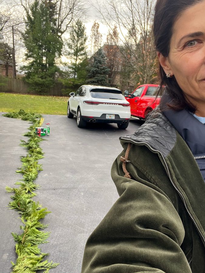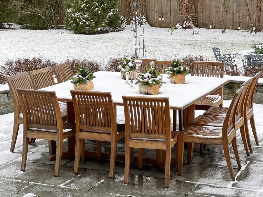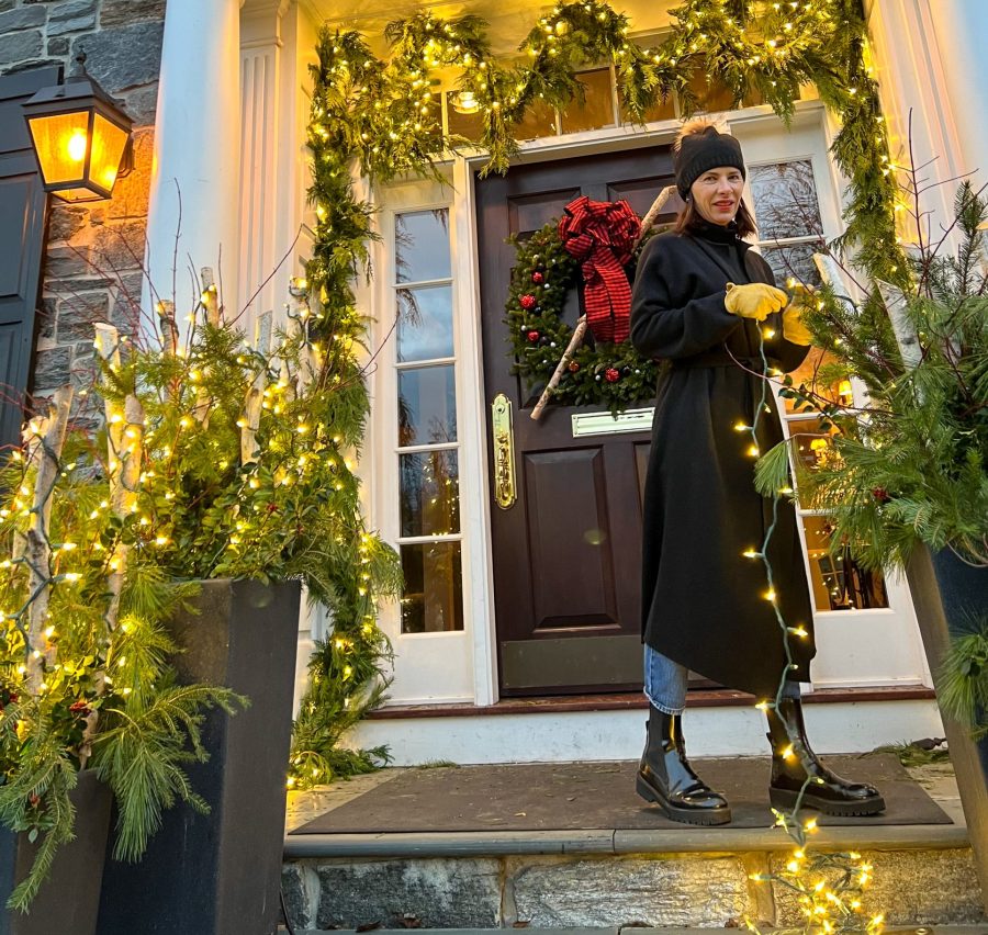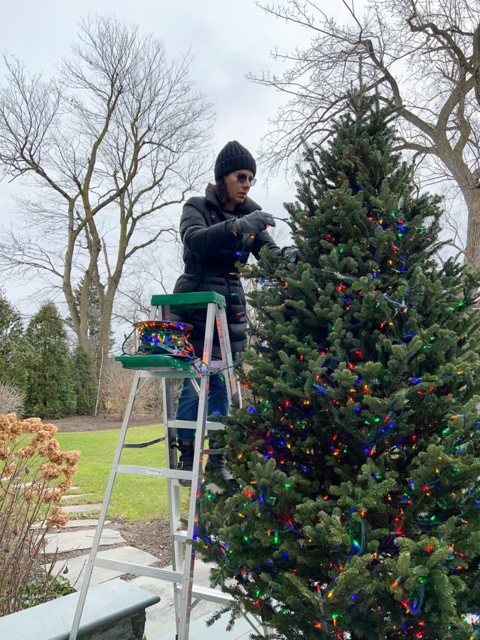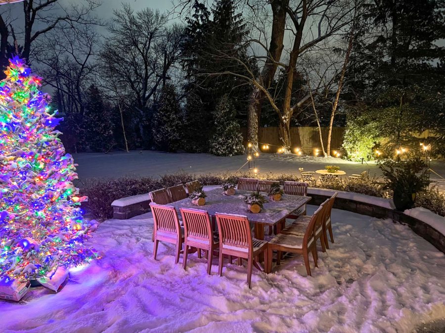 our front door was finished early in the season, justafter Thanksgiving. I’ll be taking it all down today or tomorrow, a little sad that our house didn’t welcome more friends and family this holidayhere; I created an outdoor diningarea with white birch planters I picked up at Lowe’s embellished with more fresh boxwood. I strung market lights on thelawn to add more nightglow in the backyard as many of our landscape lights are a bit in the blink