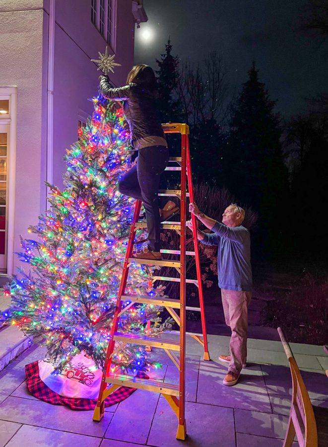 Bill wanted colored lights for the grandkids, so colored lights it was. These were a bit neon. Peyton was impressed.