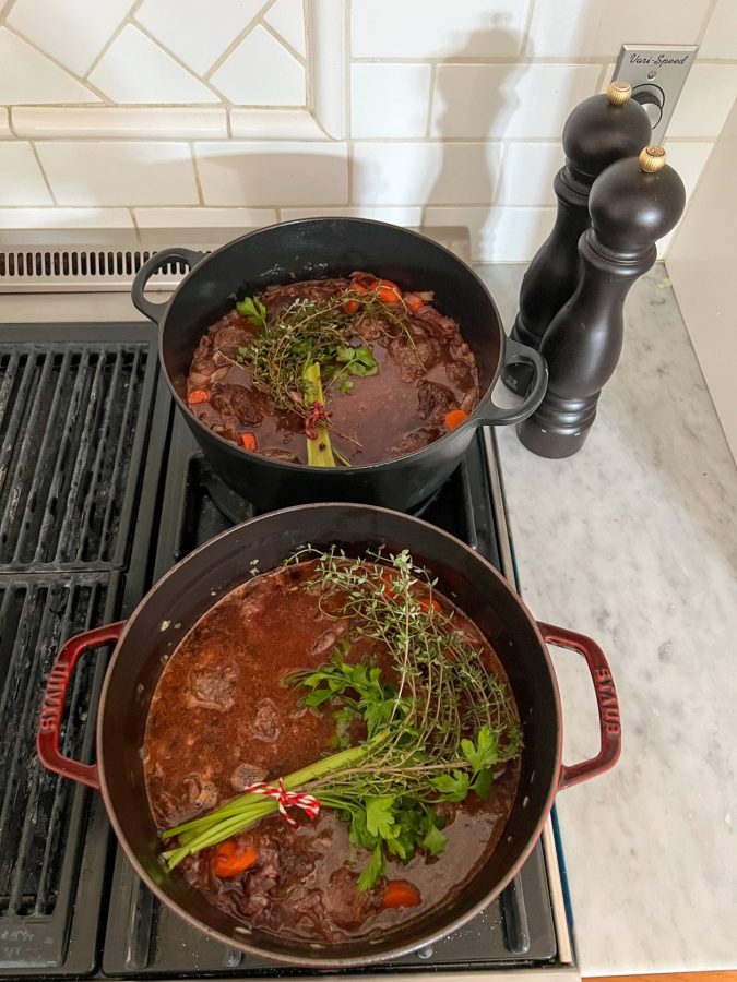 when I double a recipe, I always use two separate pots to provide more even cooking. Here is beef bourguignon that was supposed to be for fifteen and turned out to be dinner for ten, eternally grateful despite the swings