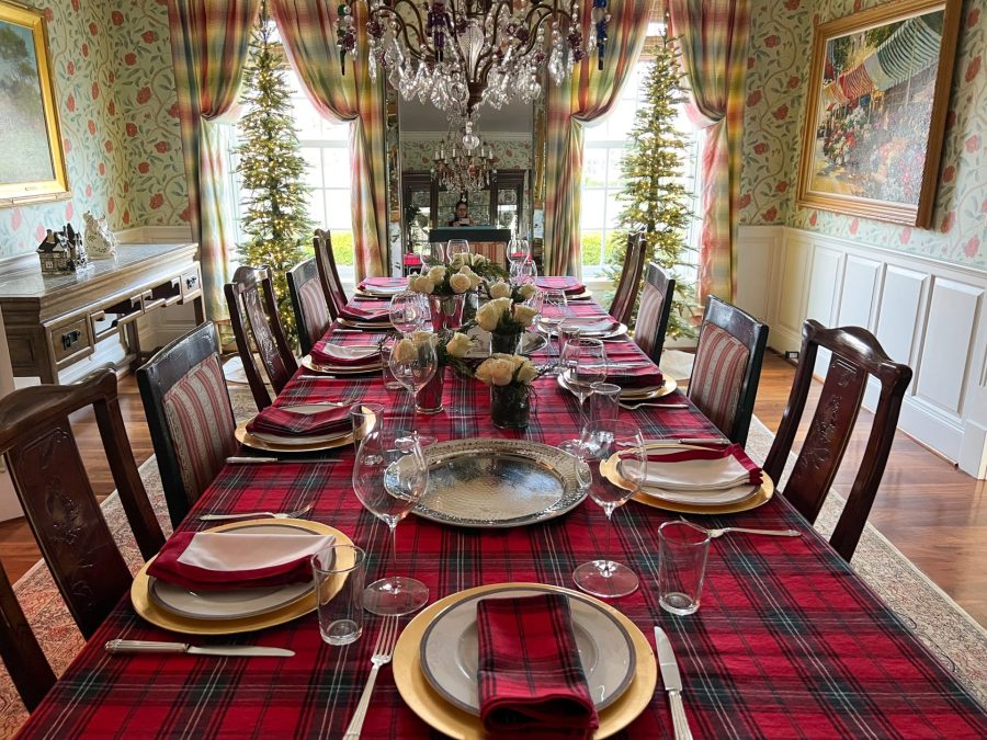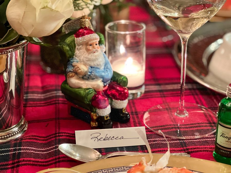 Vaccinated Santa, with a nip of gin I set the table early in the afternoon with linens bought last season on sale at Pottery Barn.