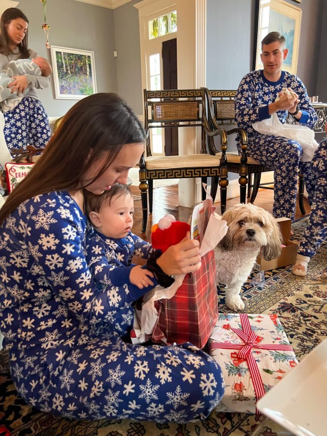Christmas morning with Rory, Lindsey, and Lucy opening gifts, and Elizabeth rocking William