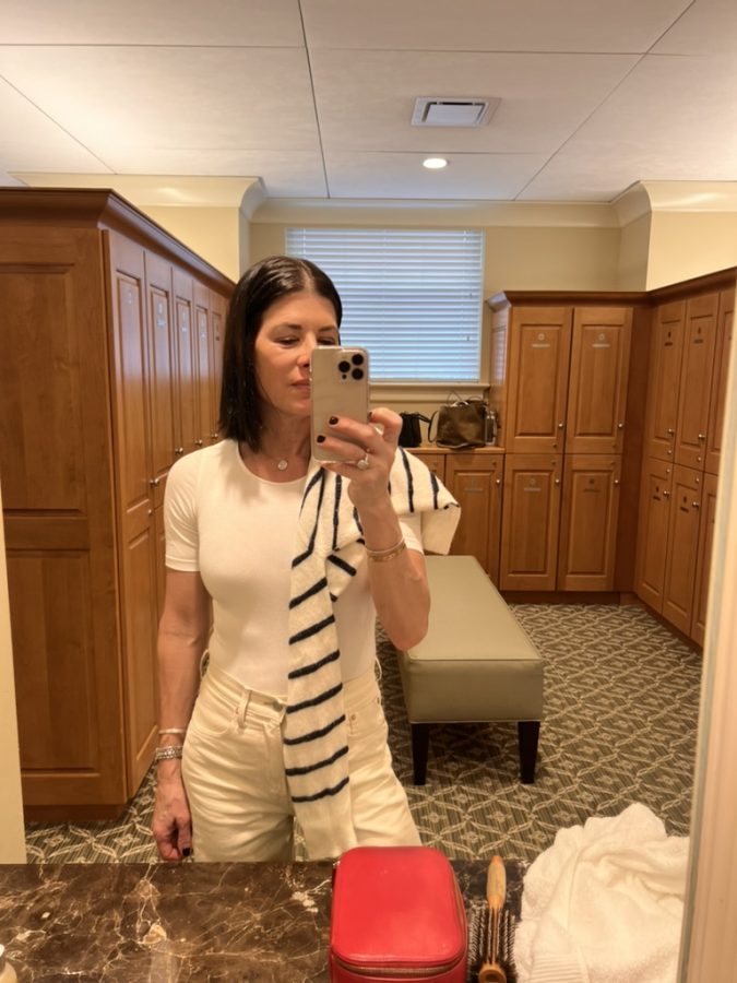 A white tee or bodysuit paired with white denim is an easy base layer for January. Add a favorite knit or leather and presto, you are dressed.