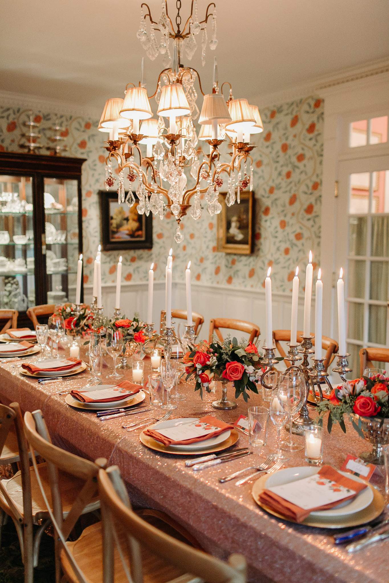 I also rented four candelabras to be placed along two eight-foot tables, our dream was to be seated outside. We had the entire party staged outdoors on my back patio until the temperature started dropping and we decided last minute to move it all inside. Our hustle game strong. Four candelabras on my indoor dining table looked heavy and crowded so we opted for three and placed the outlier in the living room, along with dozens of votives scattered all over, it was all quite dramatic.