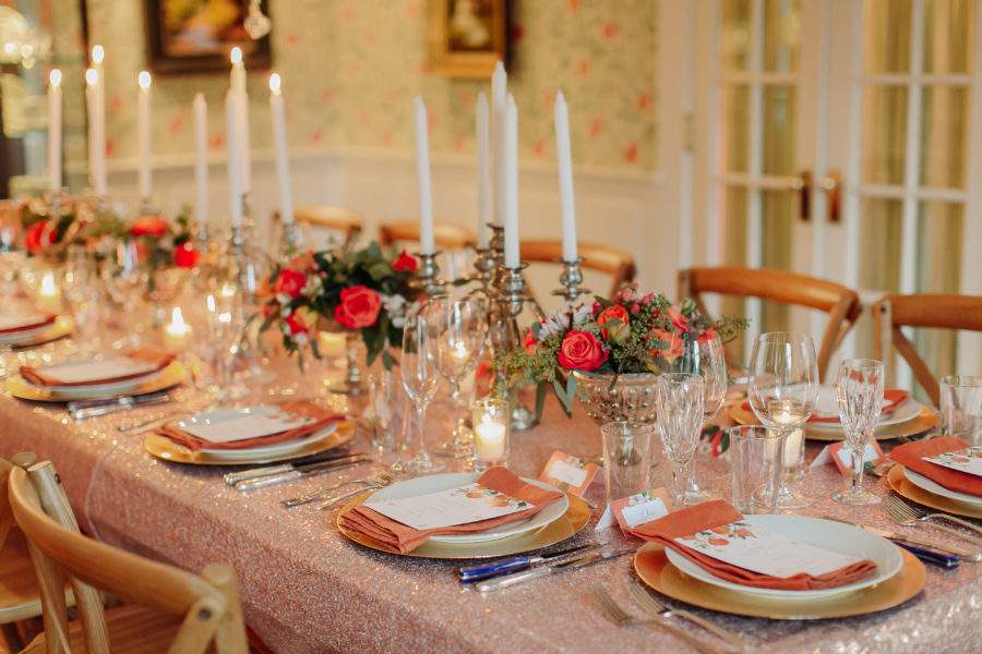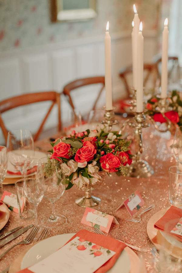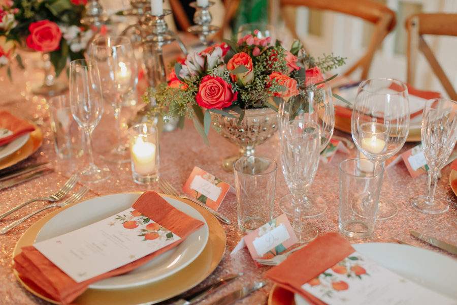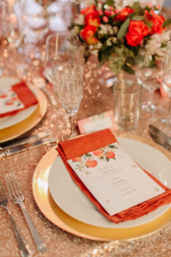 One of her favorite cocktails is an Aperol Spritz, so we used that as inspiration while planning her party. Lexi designed the invitation using oranges and flower blossoms on black card stock, switching to white card stock for the menu and place cards. Lexi also designed an amazing step and repeat, using interlocking D’s to highlight her soon-to-be married name.