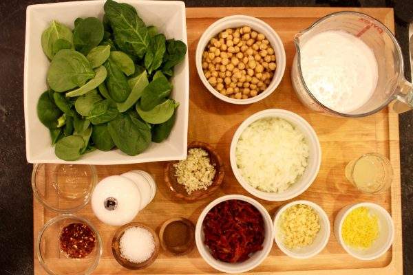 coconut chickpeas with spinach and sun-dried tomatoes over brown rice