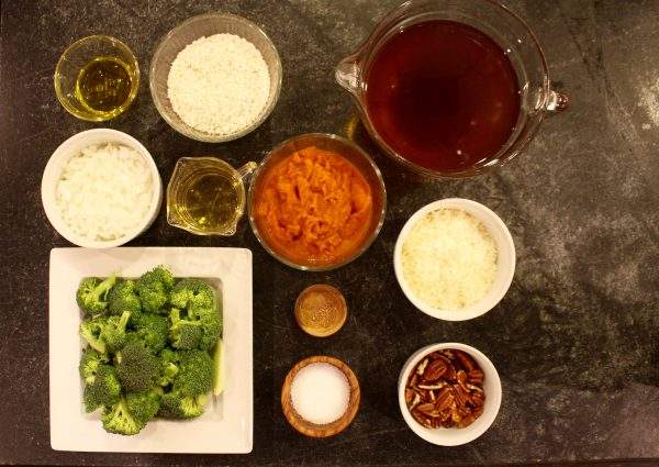 mise en place for pumpkin risotto and roasted broccoli