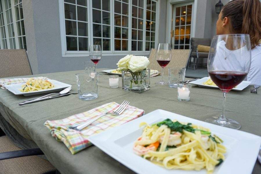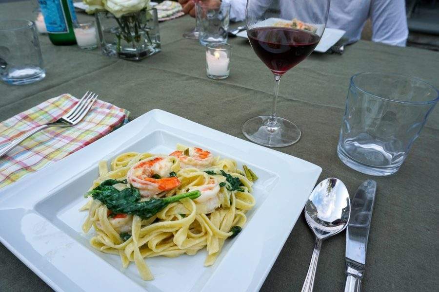 My favorite time of day is dinner with the family, and if you’ve got pasta, frozen shrimp, scallions, spinach, mascarpone cheese, dinner can be on the table in about thirty minutes or so. Add some red wine and you’ve got a small party.